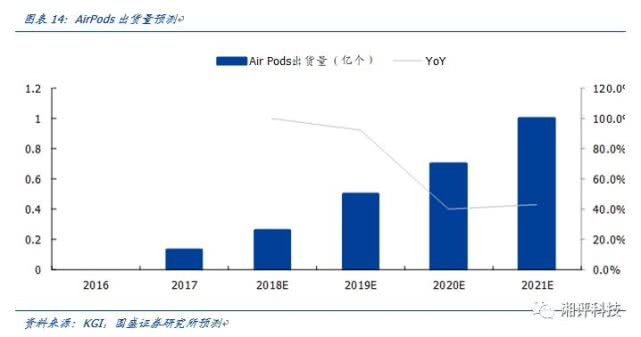 我們預(yù)計(jì)2018E/2019E/2020E AirPods的出貨量為0.26/0.5/0.7億臺(tái),2021年有望超過1億臺(tái),出貨量同比分別增長100.0%/92.3%/40.0%/42.9%。